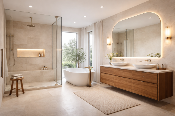 Las superficies de trabajo y encimeras se realizan en materiales técnicos de altas prestaciones, como porcelánicos o piedras naturales tratadas, que ofrecen una excelente resistencia al agua, a los productos de limpieza y al desgaste diario. La integración de lavabos, griferías y sistemas de almacenamiento se resuelve de forma discreta, priorizando la funcionalidad sin renunciar a la estética.